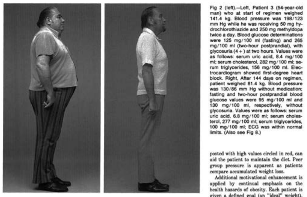 Many of the patients saw dramatic weight loss. In another, later, study, Kempner put 106 obese patients on the Rice Diet. They came in at an average of nearly 320 lbs, and lost an average of over 140 lbs, most of them in under a year. Most of their health markers improved as well.